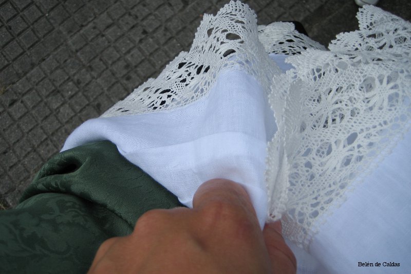 Tamén tivo que ir a Cambados, onde hai unha mercería excelente, podes atopar nela, unhas fermosas pasamanerías confeccionadas por unha avezada veciña de A Modia. Nesta ocasión a Carmiña, elixe uns adornos que semellan racimos moi apropiados co espírito da noiva. Despois as puntillas de Camariñas en branco roto, (no tempo da aboa eran crúas)… co entredós a xogo, converterán as enaguas nunha obra de arte, sen menosprezar as puntillas brancas que engalanarán a camisa…